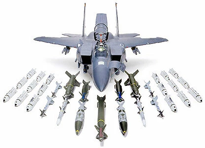 The popular F-15E Strike Eagle (item 60302) was released in 1993. However, since this items release, the F-15E has come to be equipped with a variety of newly developed weapons systems. Following the changes in times and aviation fighting technology Tamiya has modernized its kit to feature accurate replicas of all the latest weapons systems employed by the F-15E Strike Eagle. Includes parts for replication of the GBU-28 “Bunker Buster”, as well as AGM-130 and JDAM guided bombs, and ARAAM air-to-air missiles. 1/32 scale, total length 600, total width 404mm. Faithfully recreates intrepid form of Strike Eagle. Main parts such as fuselage and wings are to be fastened with screws.Radar unit/nose side-access panel, and Vulcan Cannon hatch can all be opened and closed after assembly. Canopy and air brakes can be assembled in either the up or down positions. Cockpit, radar, and Vulcan Cannon are all recreated down to the finest details. Each landing gear is brilliantly crafted in die-cast, and tires are fashioned with synthetic rubber.Each landing gear is brilliantly crafted in die-cast, and tires are fashioned with synthetic rubber.