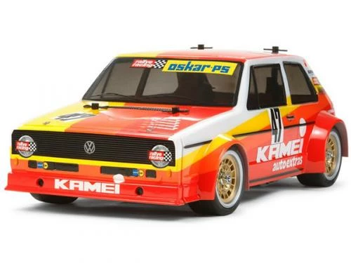 This R/C model assembly kit depicts the striking Kamei-sponsored Group 2 VW Golf which made a splash in 1970s touring car racing. The polycarbonate body accurately captures the form of the racing Golf, with wide front fenders and a sporty front spoiler. Stickers are included to recreate sponsor logos, numbers, etc.
