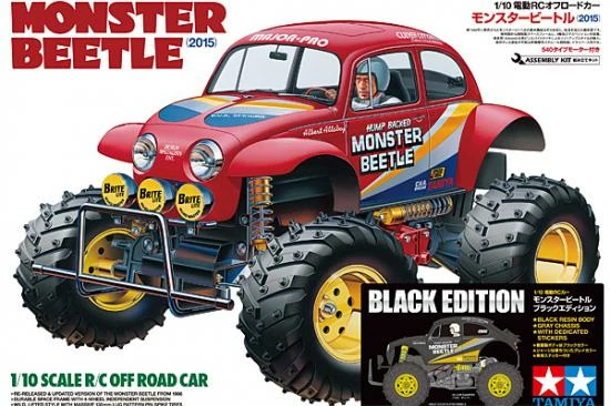 This is a special Black Edition of the re-release version of the Monster Beetle assembly kit which featured a number of updates while keeping the basic layout of the original off-road car released in 1986. A realistic customized Beetle body is depicted in tough polystyrene, molded in black and with stickers included to add gold and silver markings. A molded driver figure is the icing on top of the cake!